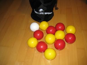 1 spel består av 13 läderbollar (6 röda, 6 blå samt 1 vit), Allt förpackat i en praktisk och snygg väska som är lätt att bära med både handtag och axelrem. Bollarna finns i 5 olika hårdhet: Supersoft, Soft, Soft/Medium, Medium, Hard Se artikelnummer 101; 102; 103och 104. Denna har hårdhet; HARD